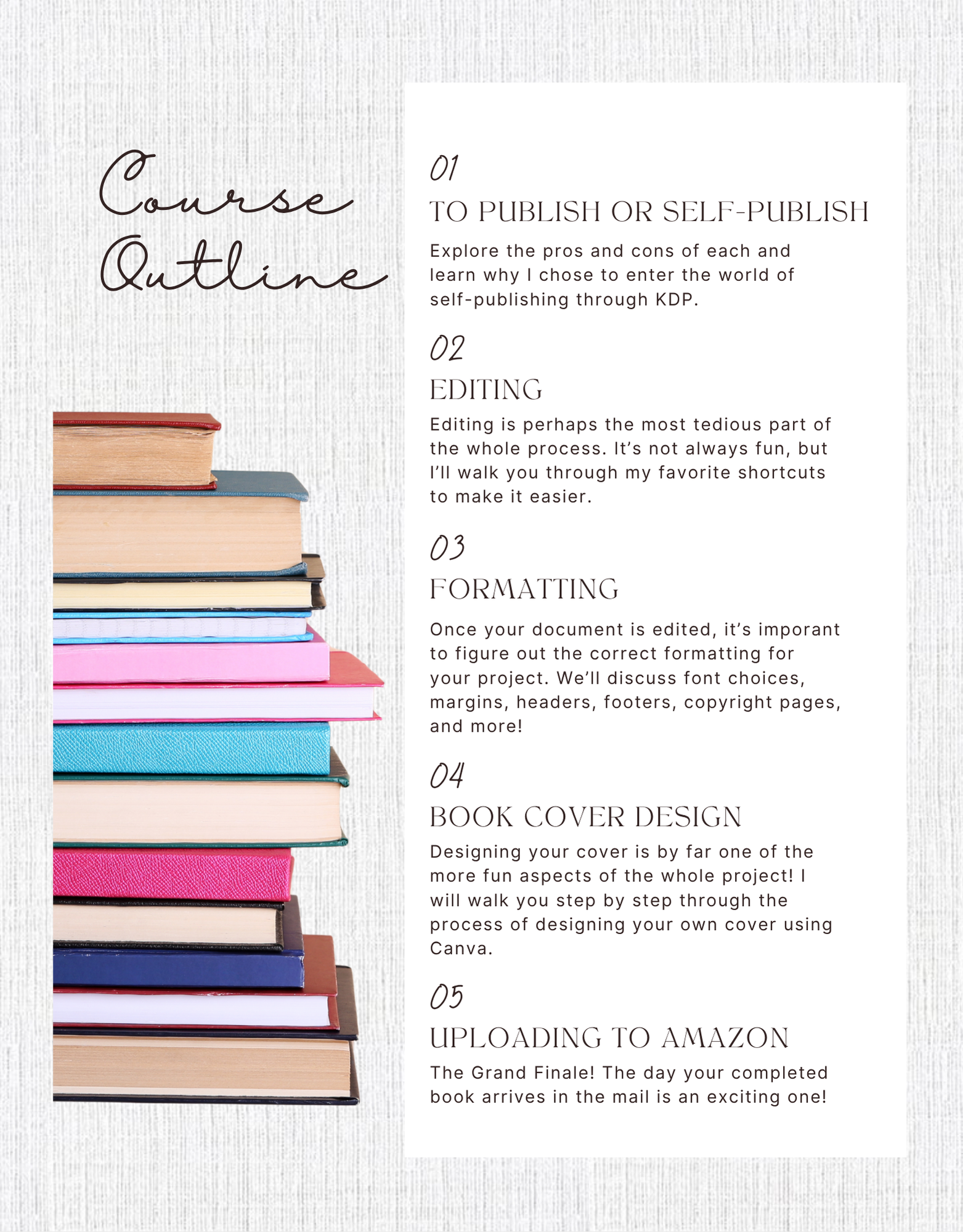 You're in the right place! Several years ago, the Lord laid it on my heart to write Abide Side by Side - a discipleship book for teenage girls. When I first started on this endeavor, writing was the easy part! After that, I had no idea where to start! I put countless hours into researching all of the options, and I landed on using KDP to self-publish. There were SO many things about the process that I had to learn! Since then, I've fallen in love with it and have used KDP to publish many other resources including devotionals, Bible reading plans, youth camp booklets, and more! My prayer is that this course will be a blessing to anyone who has a book in their heart (or maybe already on their computer) and has no idea where to start! I hope this will save you lots of time and that it will help you get your work out into the world to be a blessing to others!